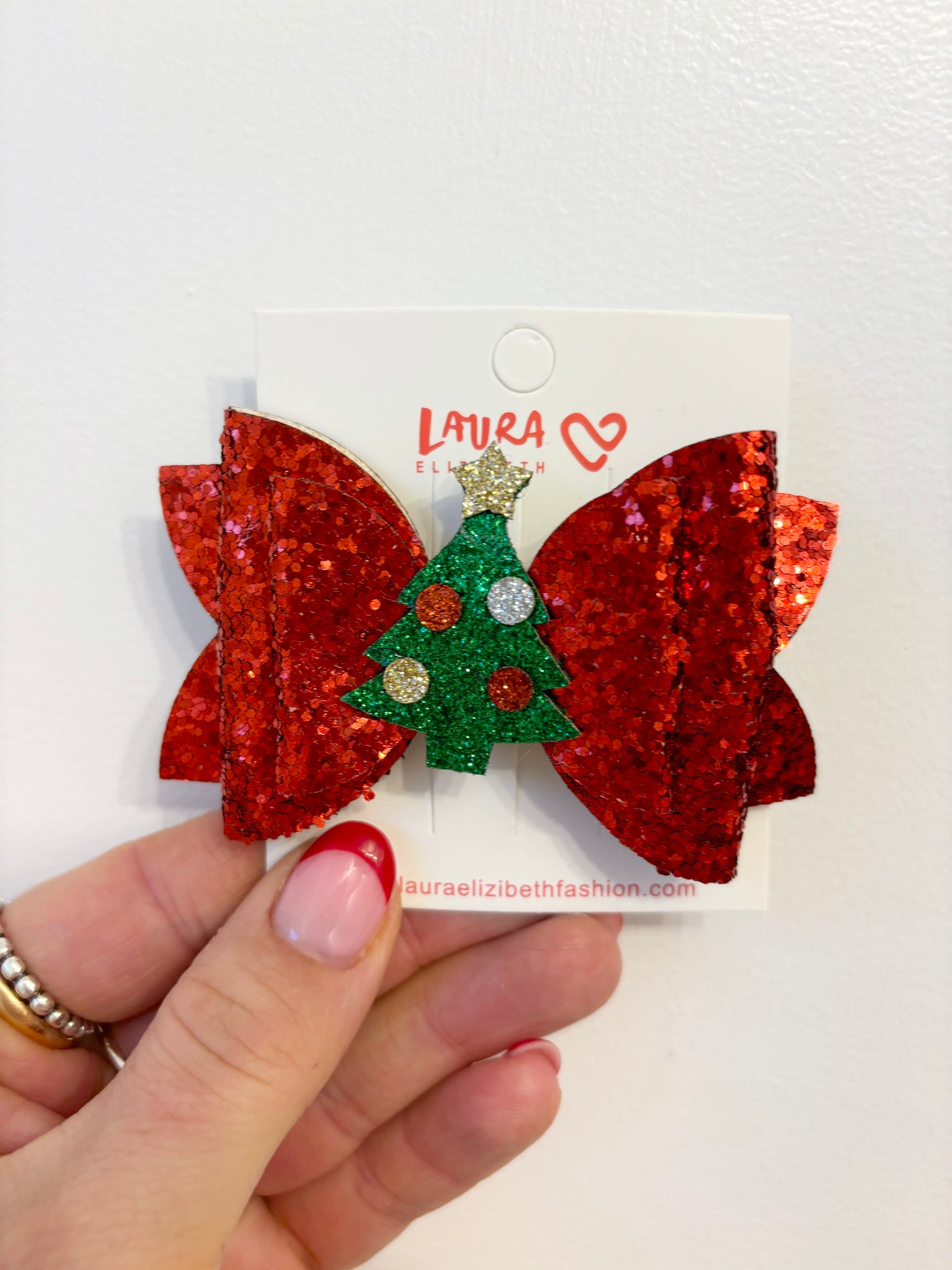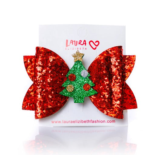 • Eye-Catching Design: A bold red bow with glittering bling and a charming Christmas tree detail.